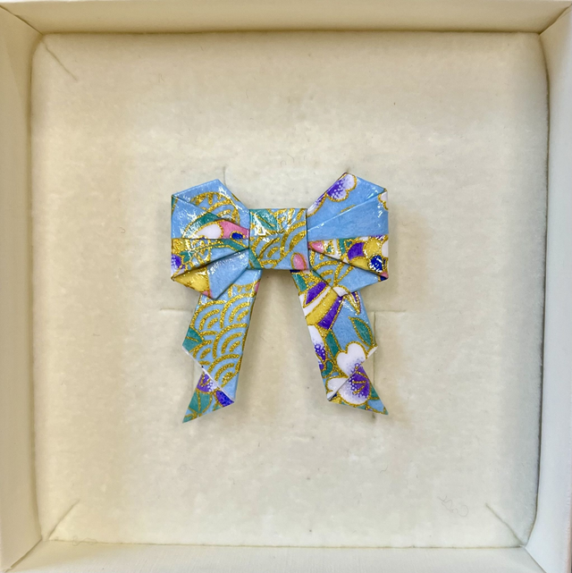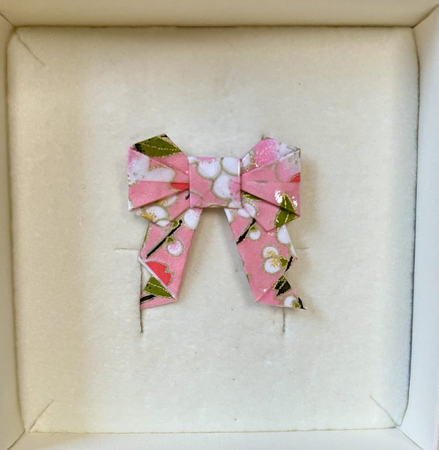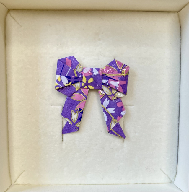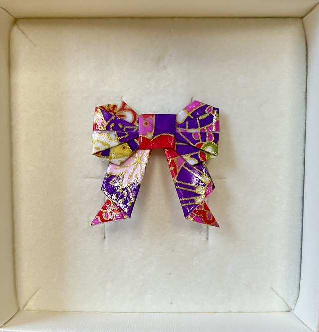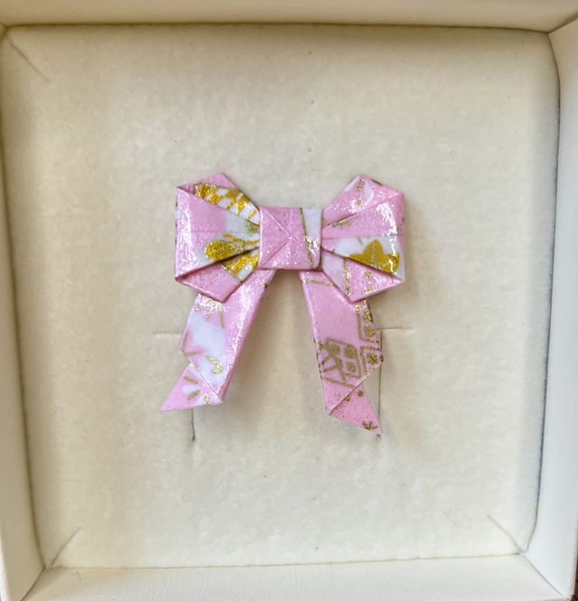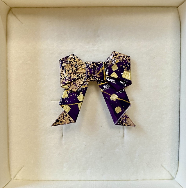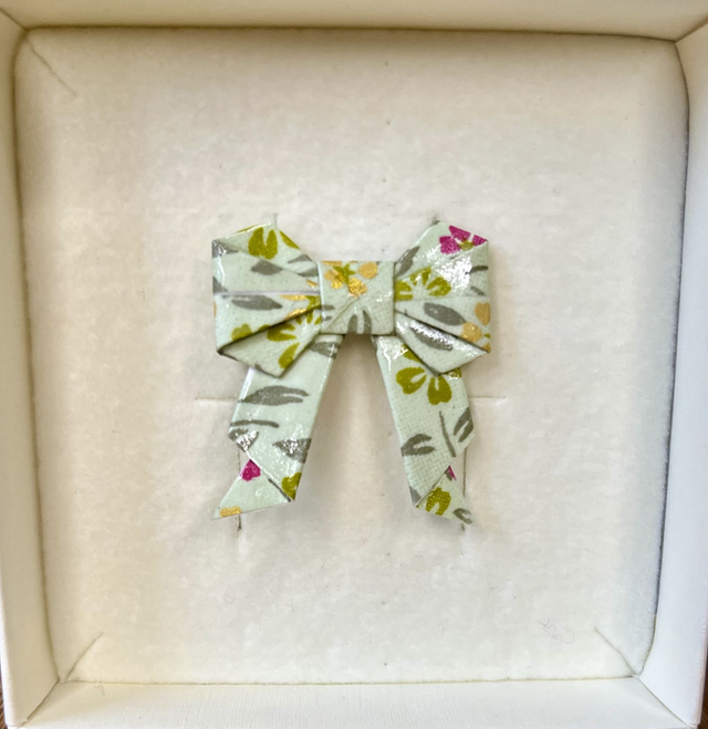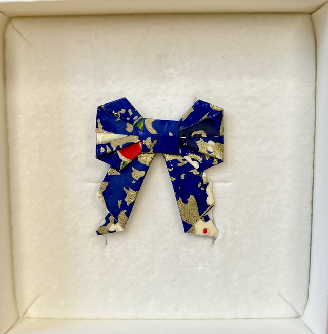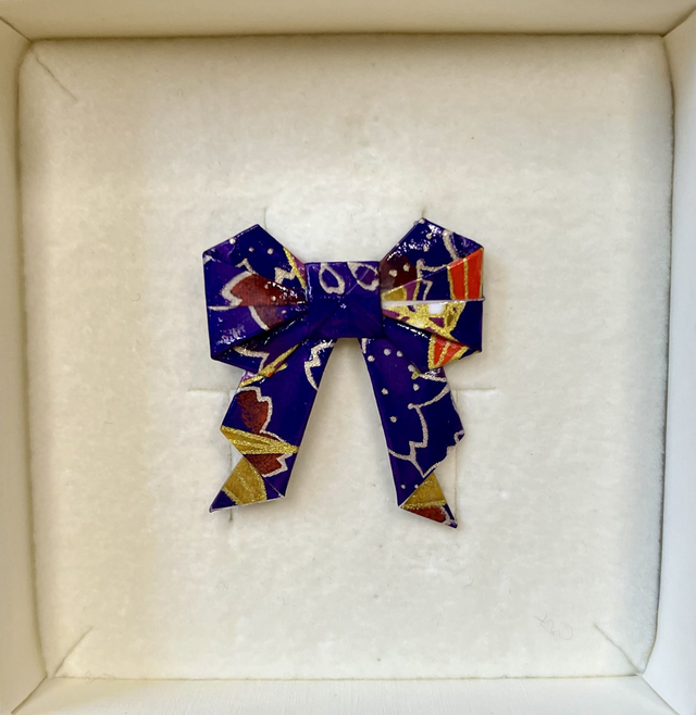 Jede Origamischleife wird von mit per Hand gefaltet, versiegelt und auf eine Broschennadel aus Edelstahl gesetzt. Das tieffarbige Papier mit Farbmuster und Goldsprenkeln verleiht jedem Outfit ein gewisses Etwas.