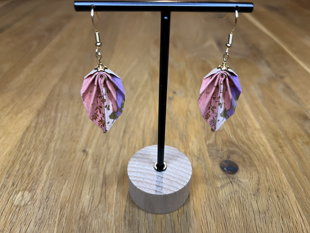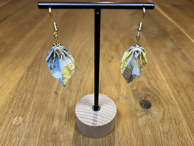 Jedes Origamiblatt wird von mit per Hand gefaltet, versiegelt und auf einen vergoldeten Edelstahlohrhänger aufgezogen. Das tieffarbige Papier mit abstraktem Farbmuster und Goldsprenkeln verleiht ihnen eine elegante, leichte Ausstrahlung.