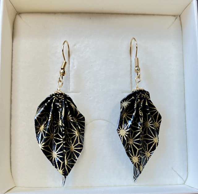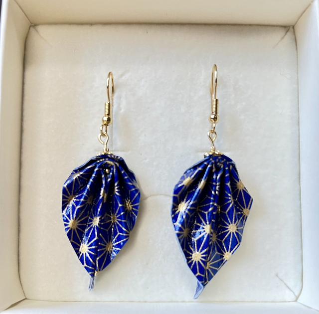 Jedes Origamiblatt wird von mit per Hand gefaltet, versiegelt und auf einen vergoldeten Edelstahlohrhänger aufgezogen. Das tieffarbige Papier mit goldenem Sternmuster verleiht ihnen eine elegante, leichte Ausstrahlung.