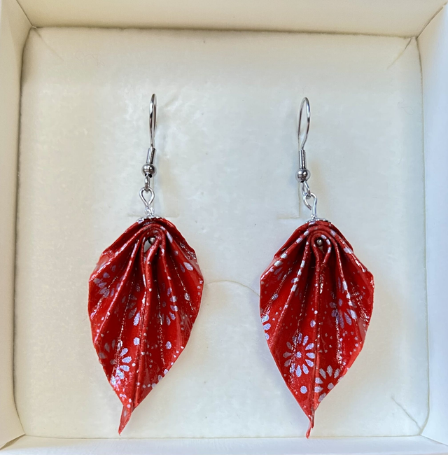 Jedes Origamiblatt wird von mit per Hand gefaltet, versiegelt und auf einen Edelstahlohrhänger aufgezogen. Das tieffarbige Papier mit silbernen Chrysanthemen verleiht ihnen eine elegante, leichte Ausstrahlung.